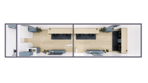 Our 40′ dual office container offers two separate workspaces, each equipped with its own kitchenette for added convenience, along with a shared bathroom in between. Built for durability and long-term use, this layout is ideal for teams or partners who need private offices while still sharing key amenities.