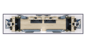 This 40′ office plan provides a spacious, highly functional environment, ideal for project leads or remote staff who require an efficient living and work space. Built with durable construction for long-term reliability, it features a small, dedicated bathroom and a compact kitchenette. This layout is a practical and flexible solution for any job site or location where teams need a portable, secure, ground-level base.